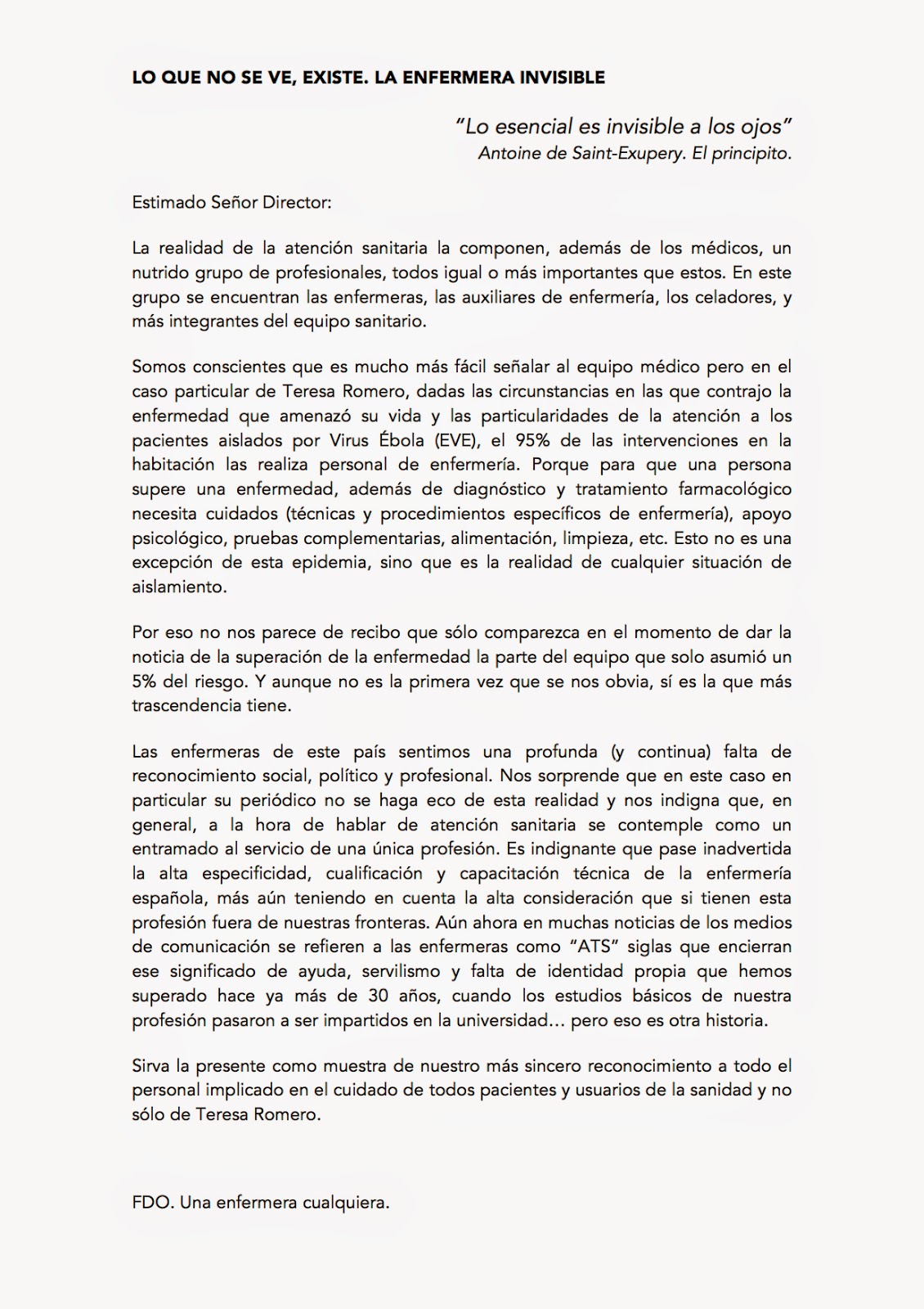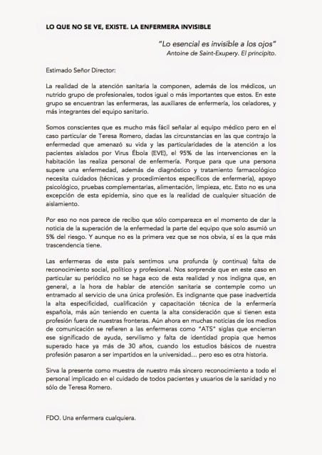 Por eso, y a razón de la difusión, merecida, pero no exclusiva, que se ha dado del equipo médico que ha tratado a Teresa Romero, un puñado de profesionales sanitarios reclamamos el protagonismo del equipo que ha cuidado a Teresa Romero.