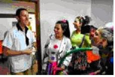 Gustavo GARCÍA Un torbellino de color, ilusión, risas y espectáculo revolucionó ayer la mañana en el Hospital de Jarrio. Un puñado de risueños payasos hicieron de las suyas, visitando los diferentes departamentos del centro llevando consigo un simple mensaje para los profesionales sanitarios: en el contacto con los pacientes, es recomendable presentarse, y preguntar «¿Cómo estás?» o «¿Qué tal?». El grupo Clowntigo, especializado en este tipo de actividades de animación por los hospitales asturianos, ha sido el vehículo elegido por los coordinadores de la iniciativa «Mírame, diferenciate» para trasladar el gesto de este mes: presentarse y preguntar.