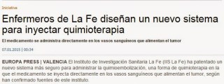 3. Enfermeros de La Fe diseñan un nuevo sistema para inyectar quimioterapia – Levante-EMV [Internet]. [cited 2015 Feb 16]. Available from: http://www.levante-emv.com/comunitat-valenciana/2015/01/07/enfermeros-fe-disenan-nuevo-sistema/1209100.html